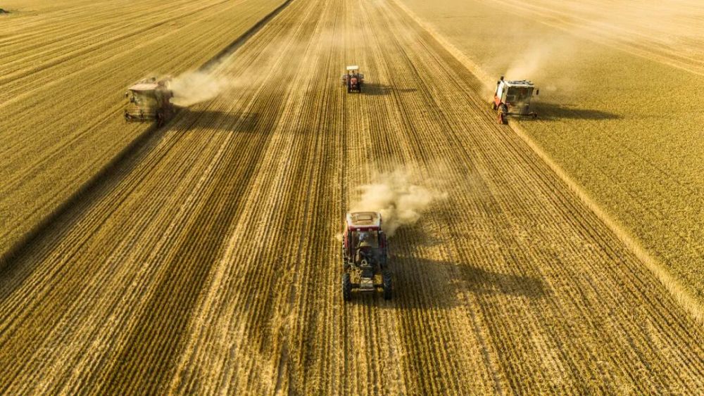 在河南省商丘市梁园区李庄镇潘堂村志诚种植农民专业合作社,农机手操作收割机、秸秆还田机、玉米精量播种机作业(无人机照片)。新华社发(李恒 摄)
